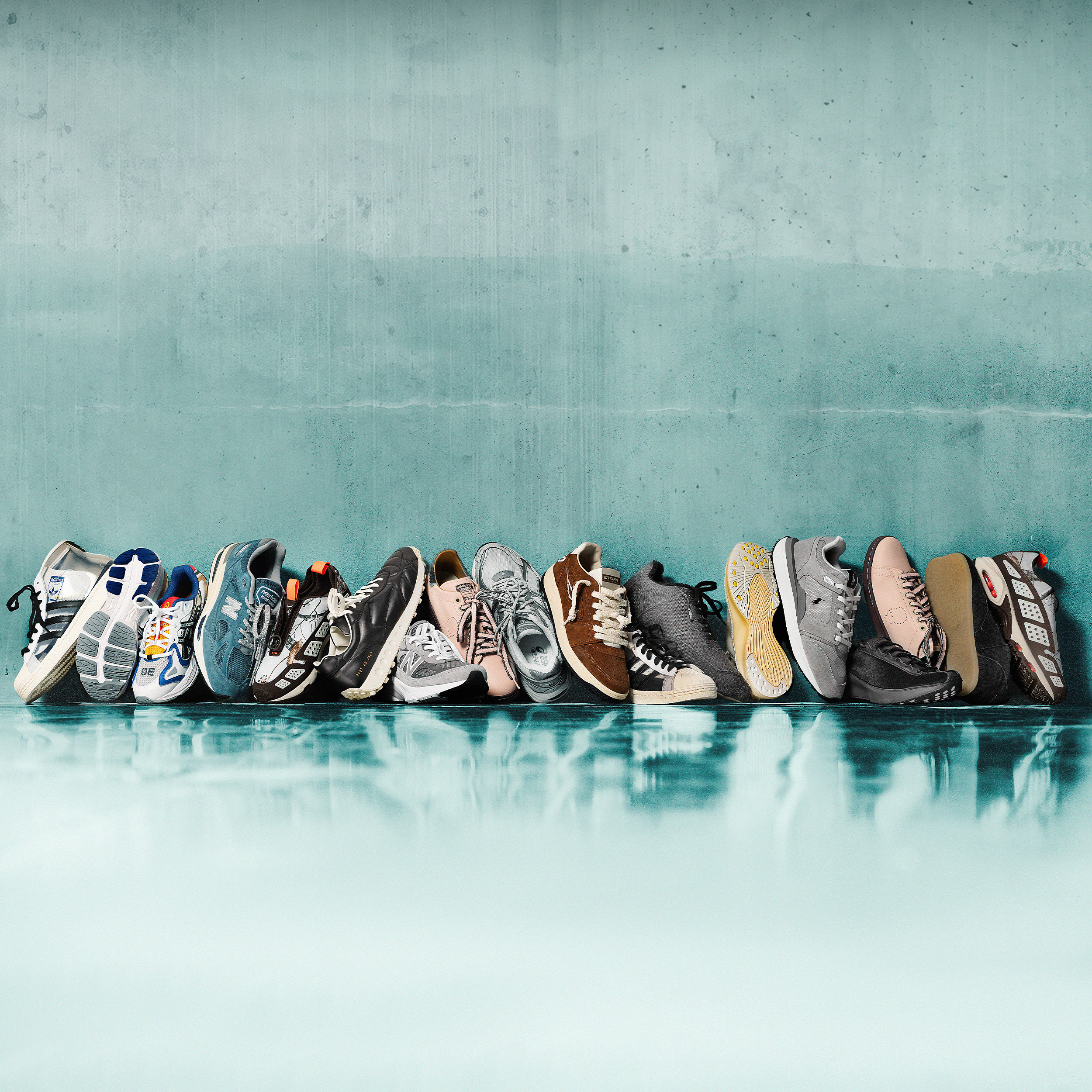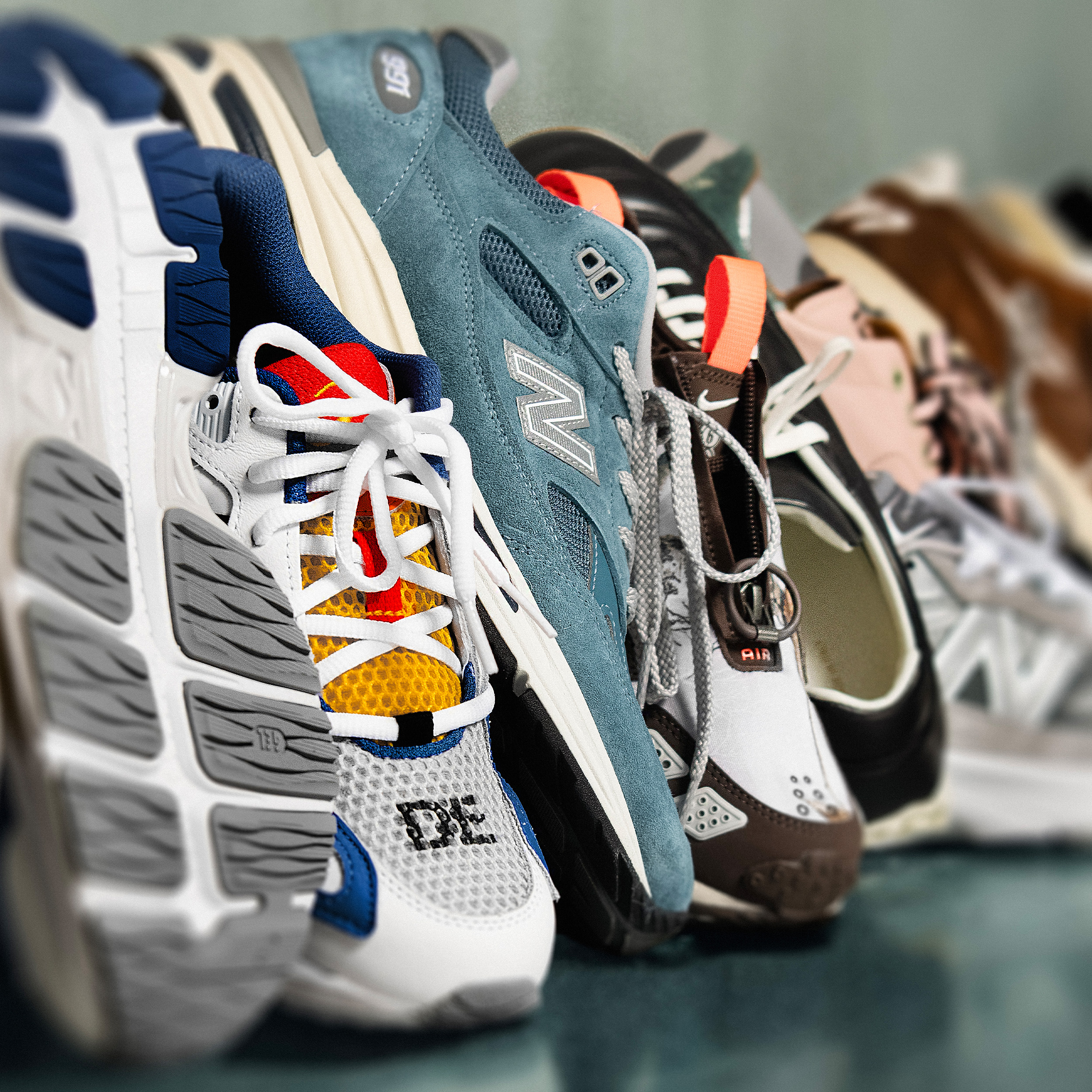 По конструкции присутствуют базовые модели на плоской подошве, массивные беговые силуэты с выраженным перекатом, лёгкие варианты для тренировок, обувь для трейловых троп с цепким протектором и поддерживающими элементами, а также состаренные дизайнерские формы с сеткой и замшевыми накладками. В материалах сочетаются гладкая кожа, замша, техническая сетка, нейлон, ткань рипстоп и текстиль с водоотталкивающей пропиткой. Многие пары оснащены фирменными амортизирующими системами: воздушными капсулами, пенными вставками с возвратом энергии или стабилизирующими пластинами.
