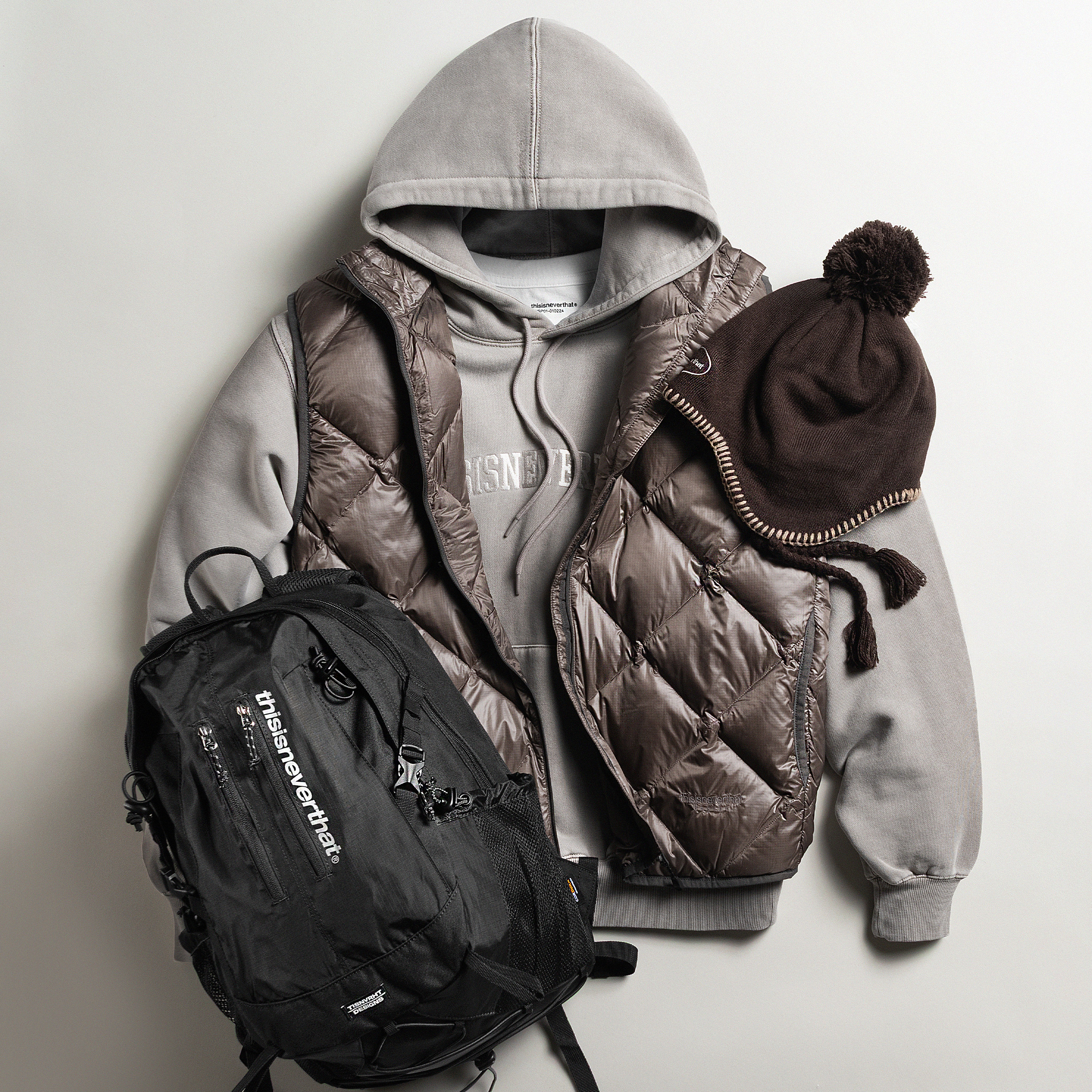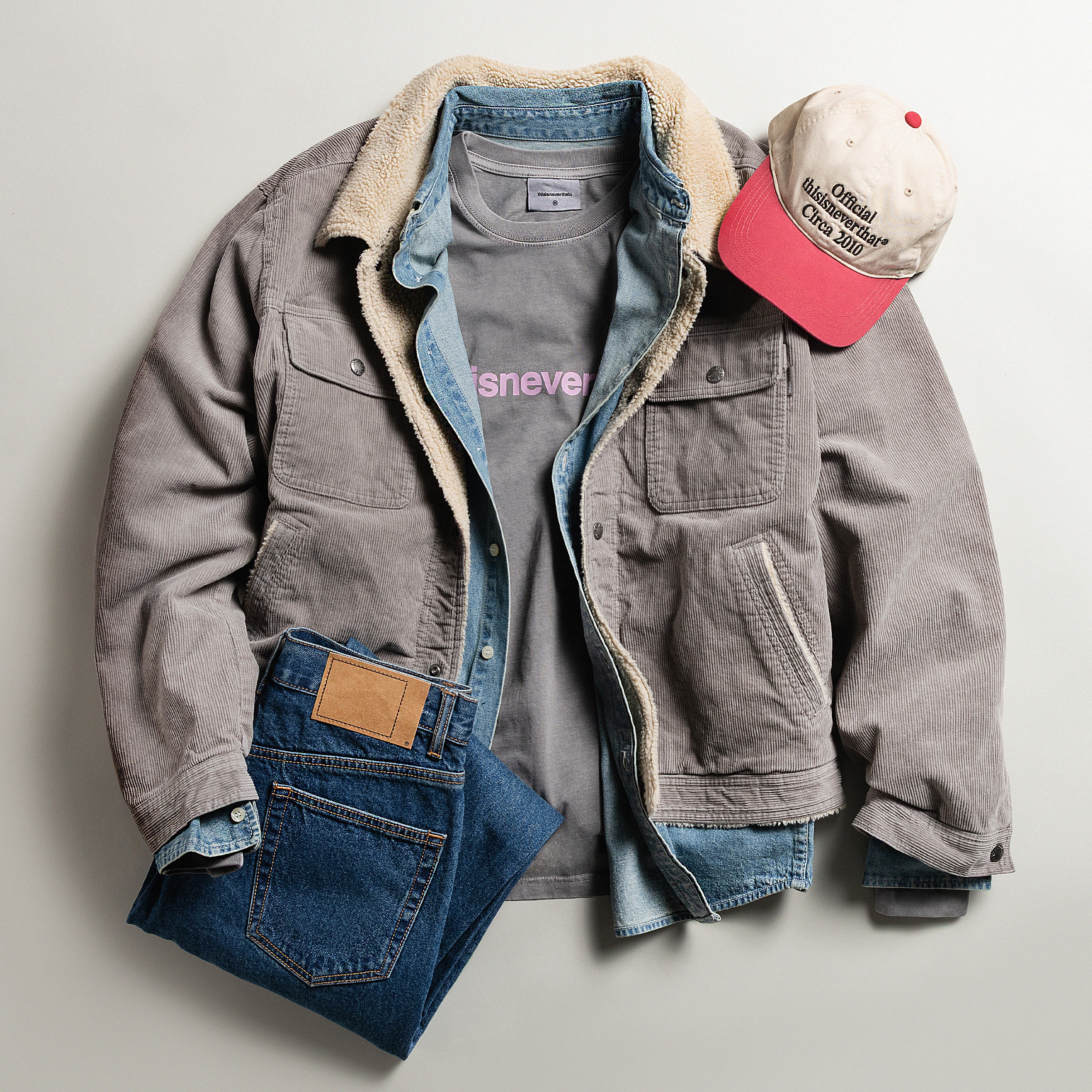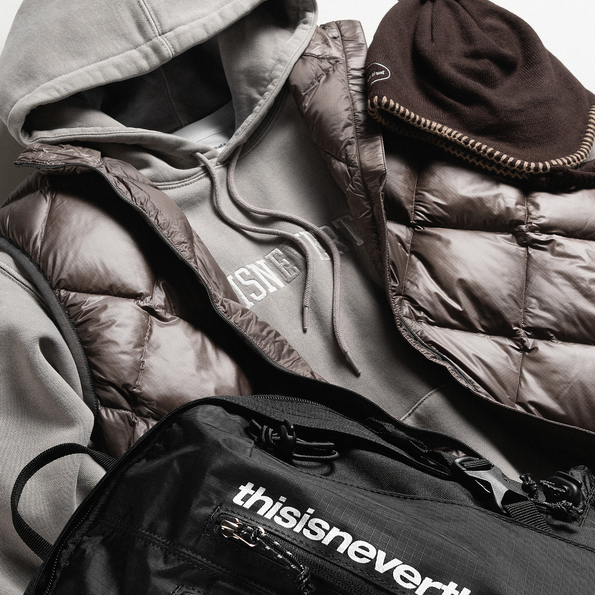 В ассортименте встречаются вещи, опирающиеся на утилитарные и рабочие корни, но представленные в более современной интерпретации. Куртки на молнии, свитшоты, рубашки свободного кроя, брюки с объемными карманами и легкие пуховики составляют основу коллекций. Марка активно использует технические ткани, включая плотный рипстоп, устойчивые флисовые полотна и обработку Garment Dye, создающую глубокую выношенную палитру. Одновременно бренд применяет хлопок высокой плотности и сочетает его с современными синтетическими материалами, что подчеркивает характерный баланс практичности и эстетики.