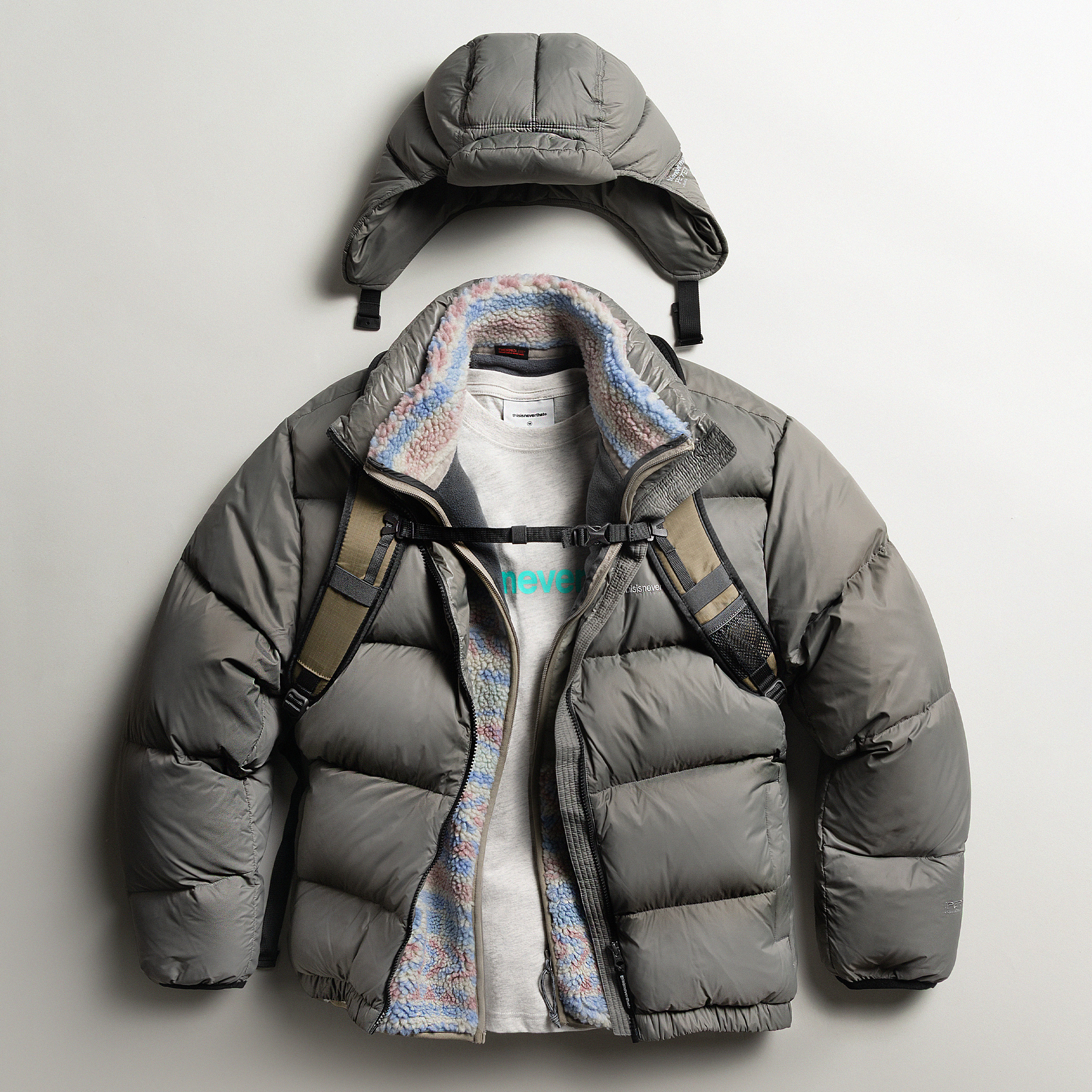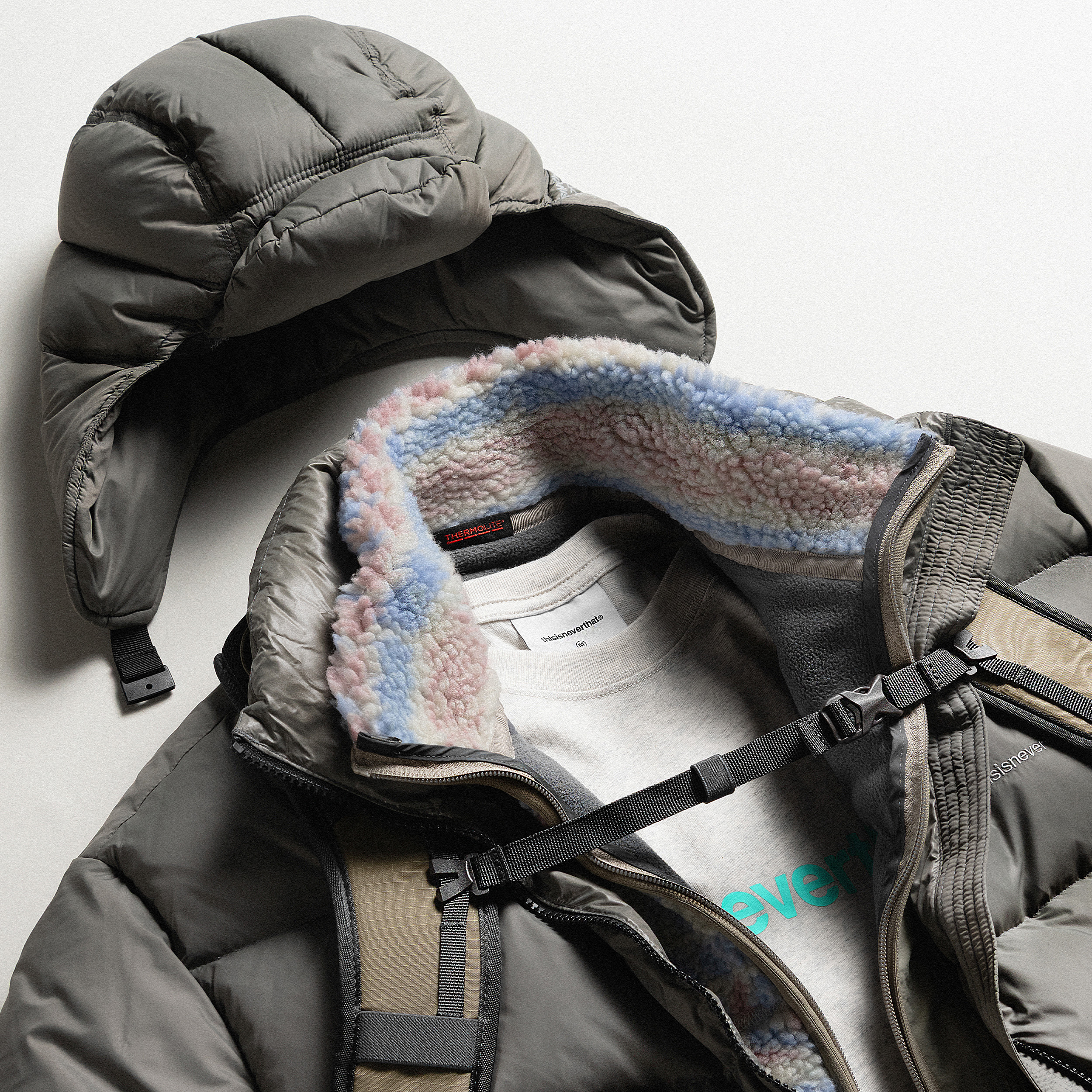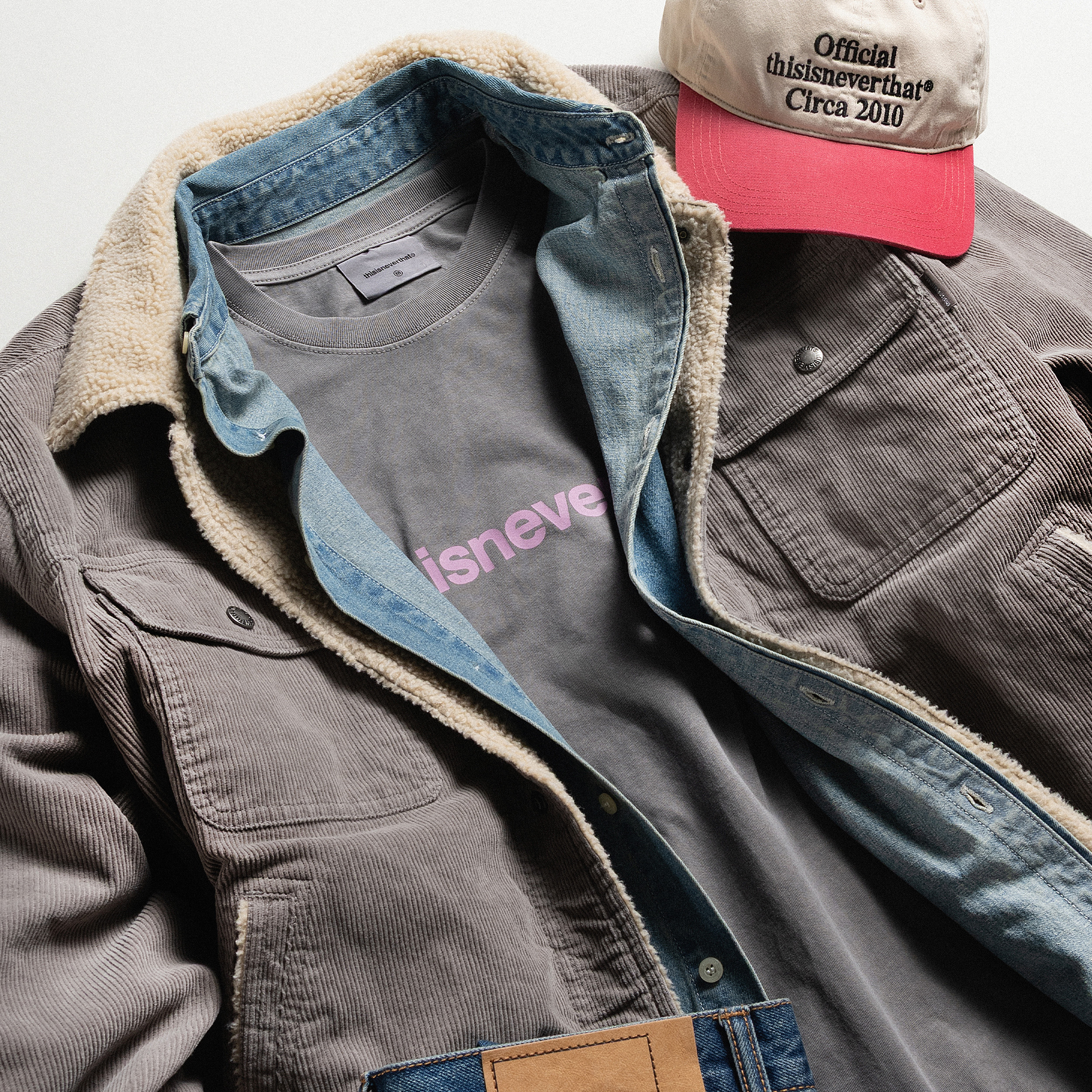 В ассортименте встречаются вещи, опирающиеся на утилитарные и рабочие корни, но представленные в более современной интерпретации. Куртки на молнии, свитшоты, рубашки свободного кроя, брюки с объемными карманами и легкие пуховики составляют основу коллекций. Марка активно использует технические ткани, включая плотный рипстоп, устойчивые флисовые полотна и обработку Garment Dye, создающую глубокую выношенную палитру. Одновременно бренд применяет хлопок высокой плотности и сочетает его с современными синтетическими материалами, что подчеркивает характерный баланс практичности и эстетики.