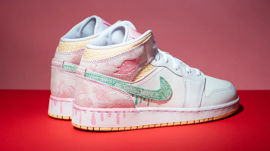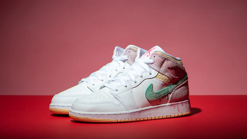 Бренд Jordan предлагает эксклюзивную расцветку, созданную в подростковых размерах. Классический силуэт Jordan 1 Mid в белой коже интересен своим «свушем» и пяточной частью, на которые нанесена краска в нарочито небрежном стиле. Модель дополнена акцентами солнечно-жёлтого цвета на заднике и стельках. Как итог — пара в контрастных тонах с эффектом потёртости.